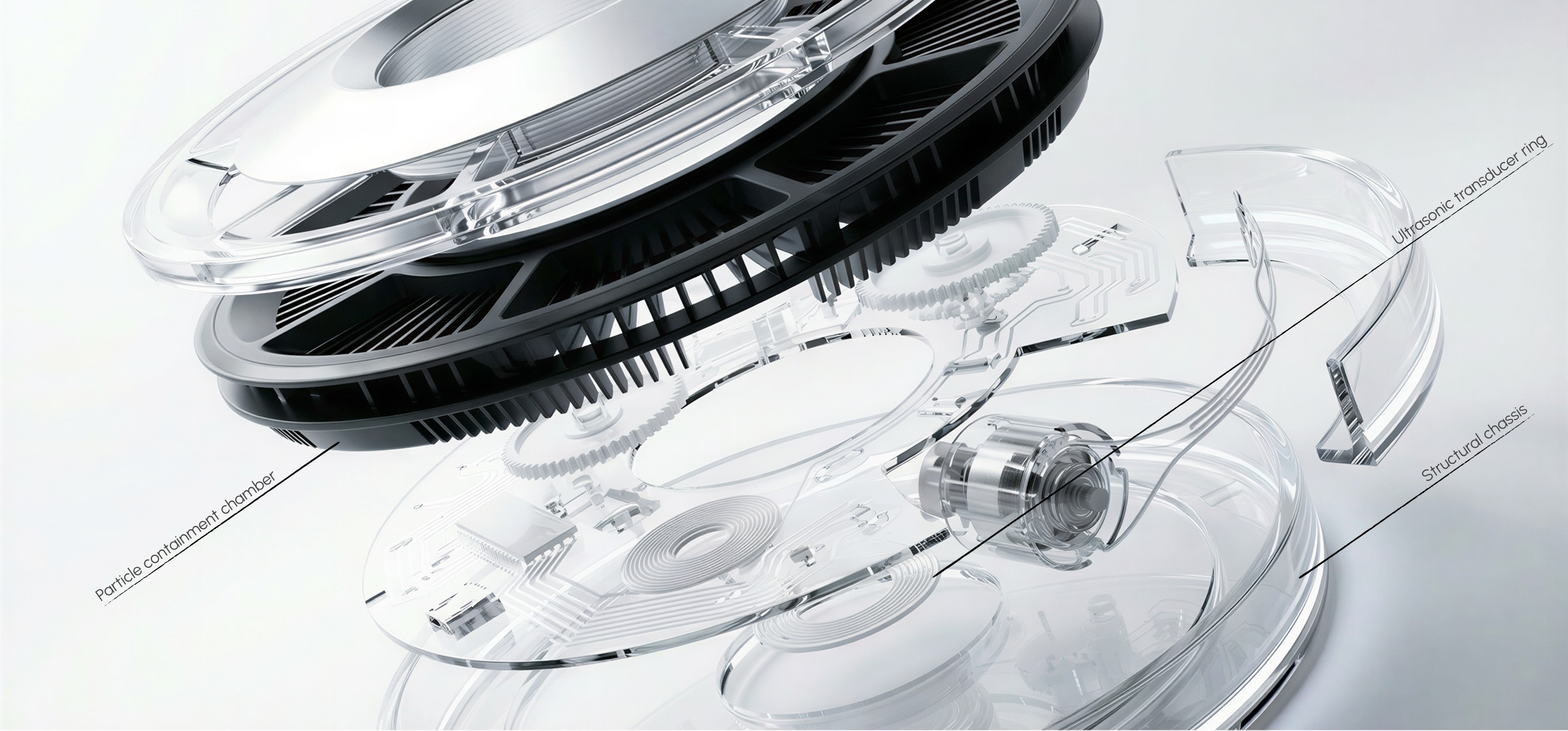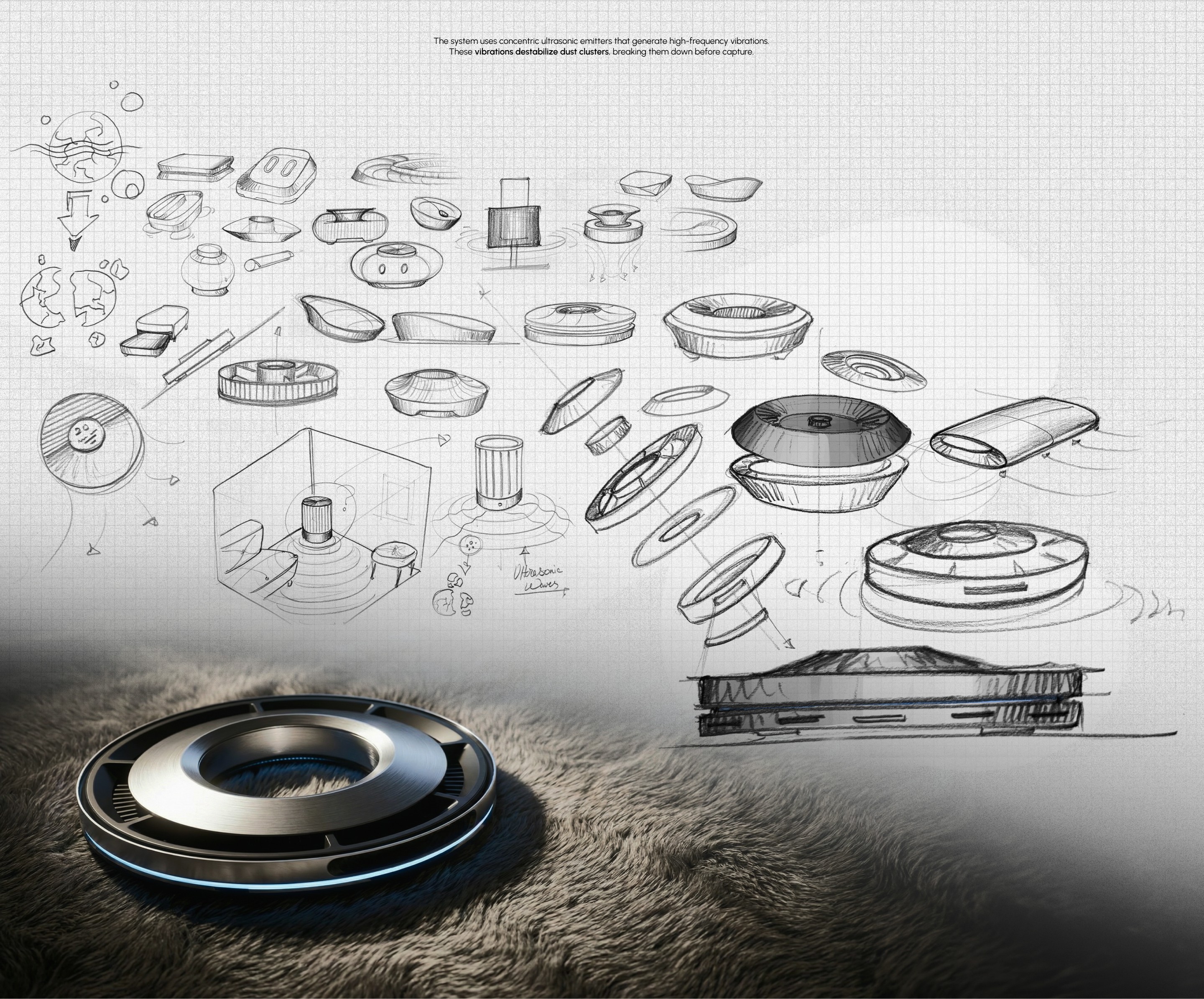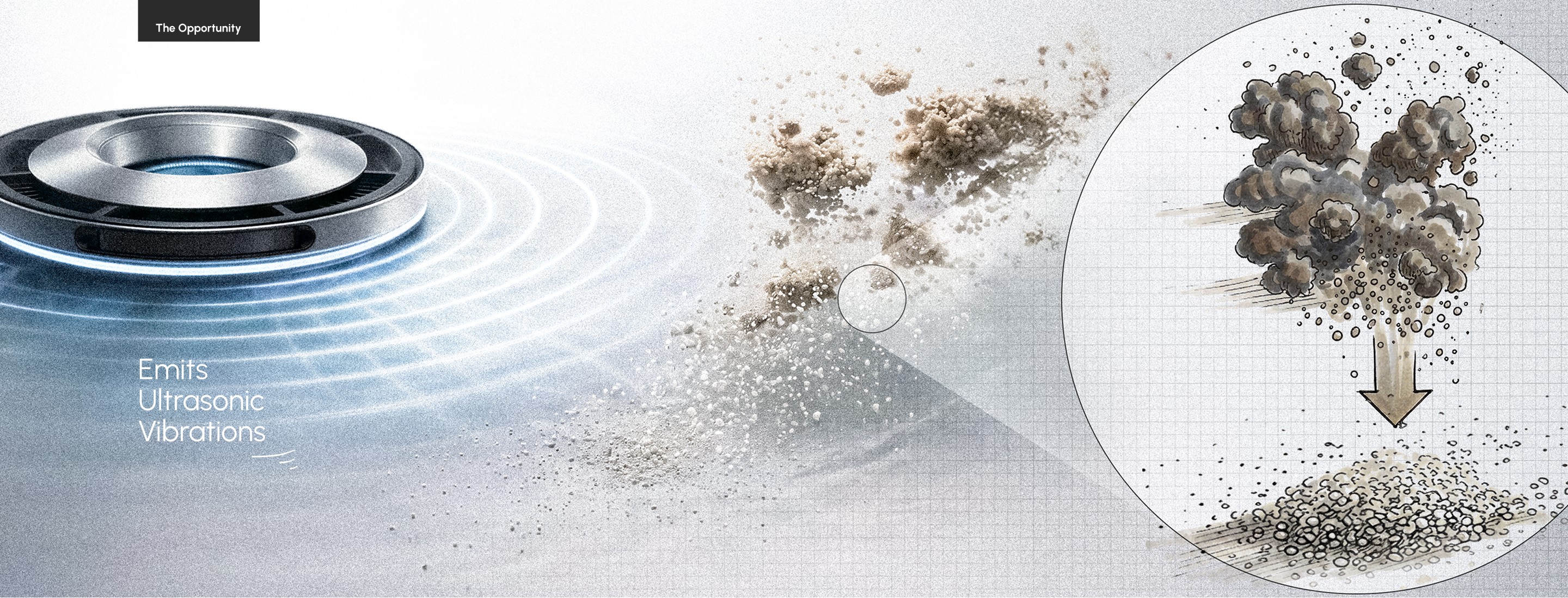 This separation between dust interaction and dust capture creates a controlled zone beneath the device, allowing particles to remain suspended longer within the ultrasonic field.