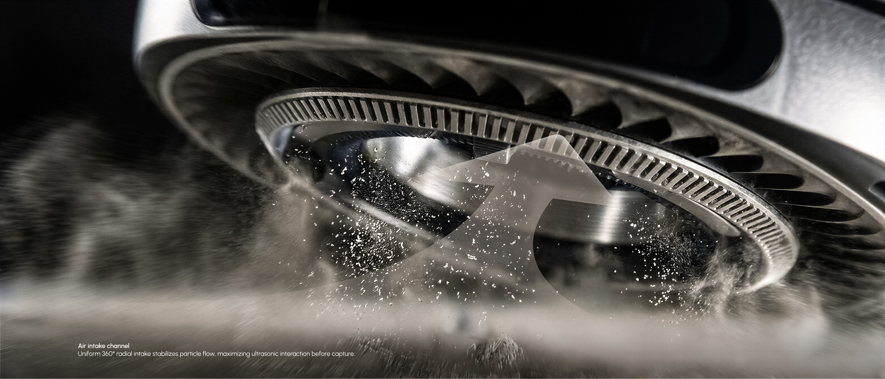 By delaying capture, dust is exposed to consistent ultrasonic fragmentation before being guided upward for final collection.