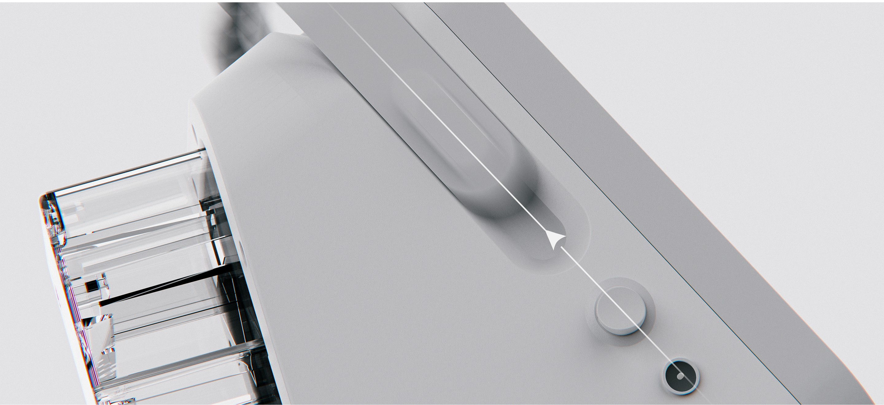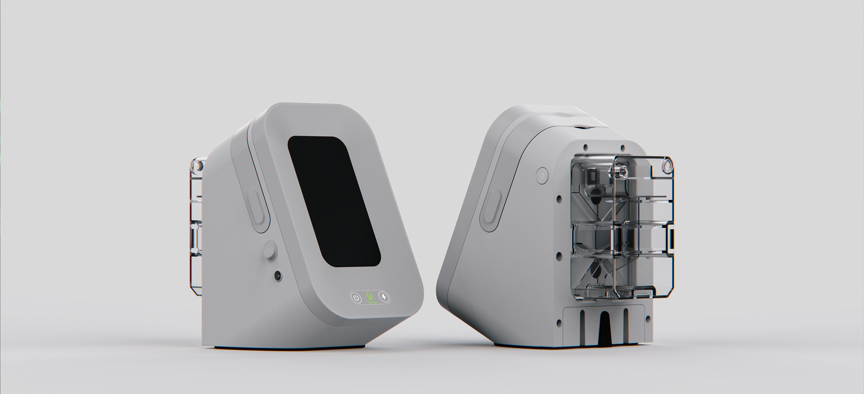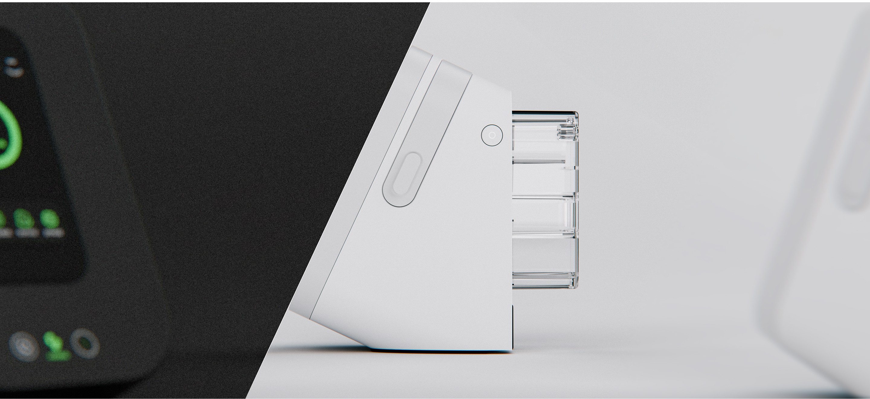 This design adopts a human-centered, home-compatible medical design language, balancing clinical trust with approachability. A compact, monolithic enclosure minimizes seams to support hygiene and regulatory cleaning requirements, while a neutral, soft-matte CMF reduces visual stress and medical intimidation. The forward-slanted display enhances glanceability across bedside and tabletop use, improving posture and reducing cognitive load.