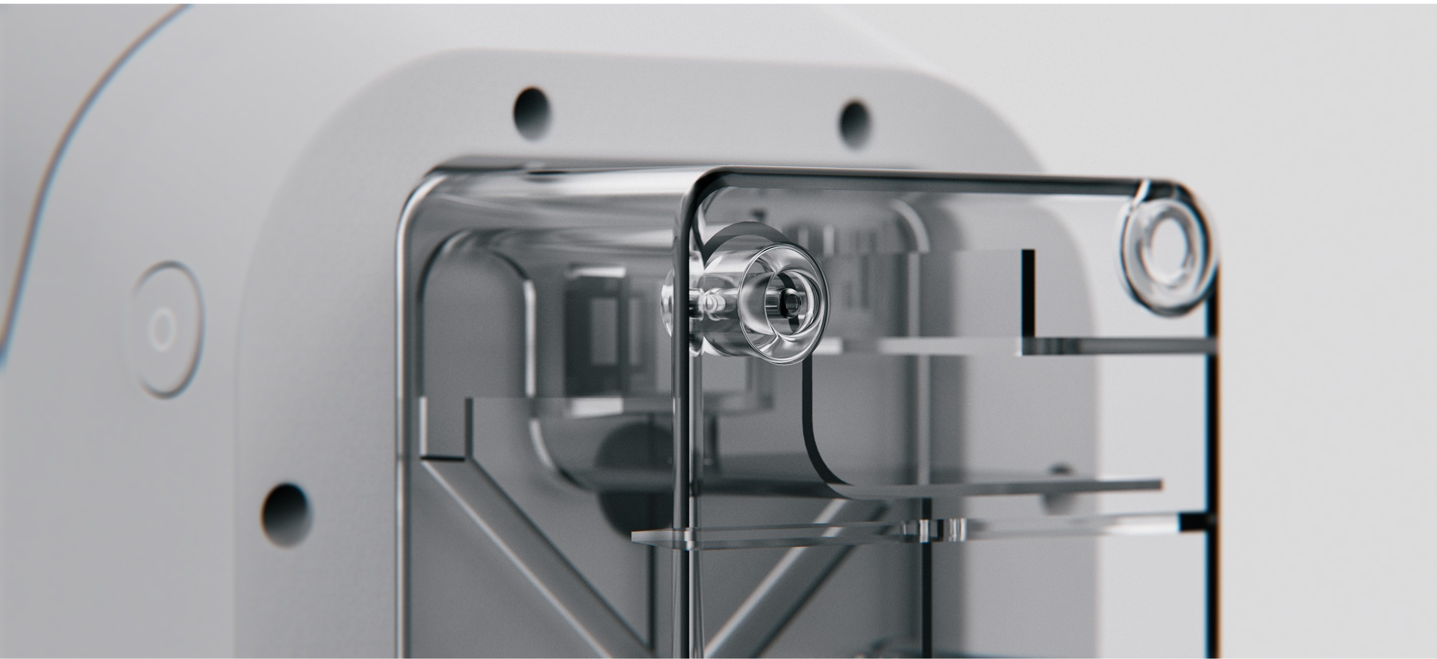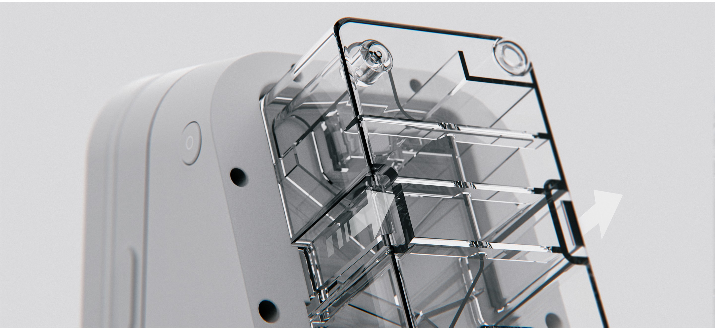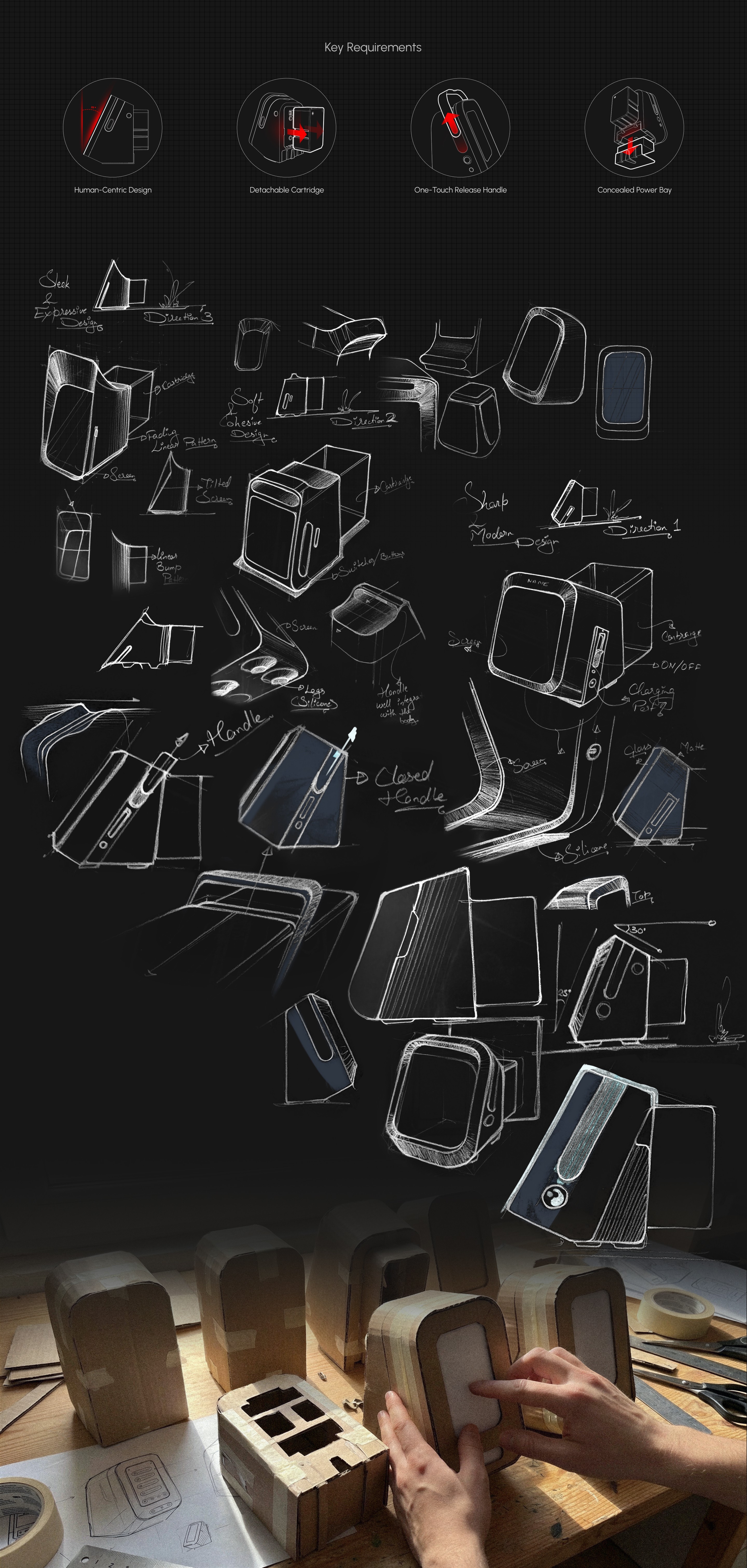 This design adopts a human-centered, home-compatible medical design language, balancing clinical trust with approachability. A compact, monolithic enclosure minimizes seams to support hygiene and regulatory cleaning requirements, while a neutral, soft-matte CMF reduces visual stress and medical intimidation. The forward-slanted display enhances glanceability across bedside and tabletop use, improving posture and reducing cognitive load.